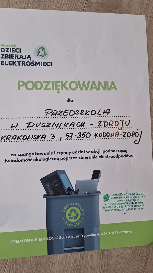 Nasza placówka przedszkolna z zaangażowaniem wzięła udział w ogólnopolskiej akcji „Wszystkie dzieci zbierają elektrośmieci”, której celem jest kształtowanie postaw proekologicznych oraz zwiększanie świadomości na temat właściwej segregacji i utylizacji zużytego sprzętu elektrycznego i elektronicznego.